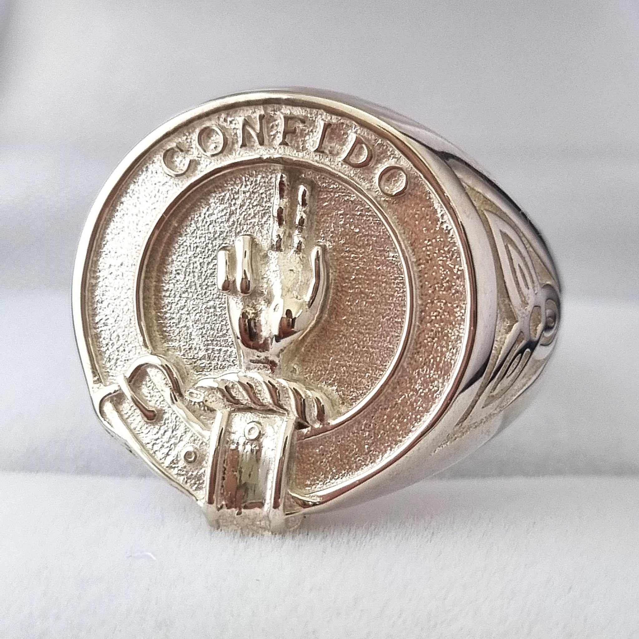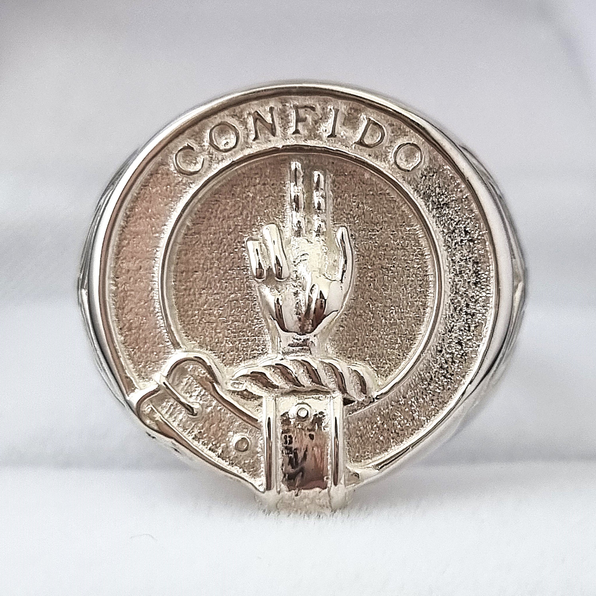 This beautiful Boyd Clan Crest signet ring bears the motto `CONFIDO' (I trust); the crest shows a dexter hand erect, with the last two fingers bowed inwards.