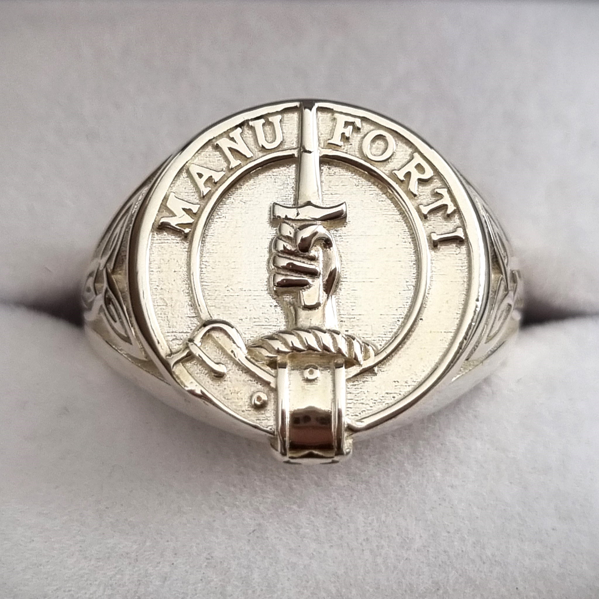 This magnificent Mackay Clan Crest signet ring carries the Mackay Crest of a hand holding a dagger and the proud Mackay clan motto 'MANU FORTI' (With a strong hand). These rings have celtic triquetra designs on the sides and are popular for women and for men's pinkie rings. This ring can be made to order in sterling silver. Gold available on request (POA).