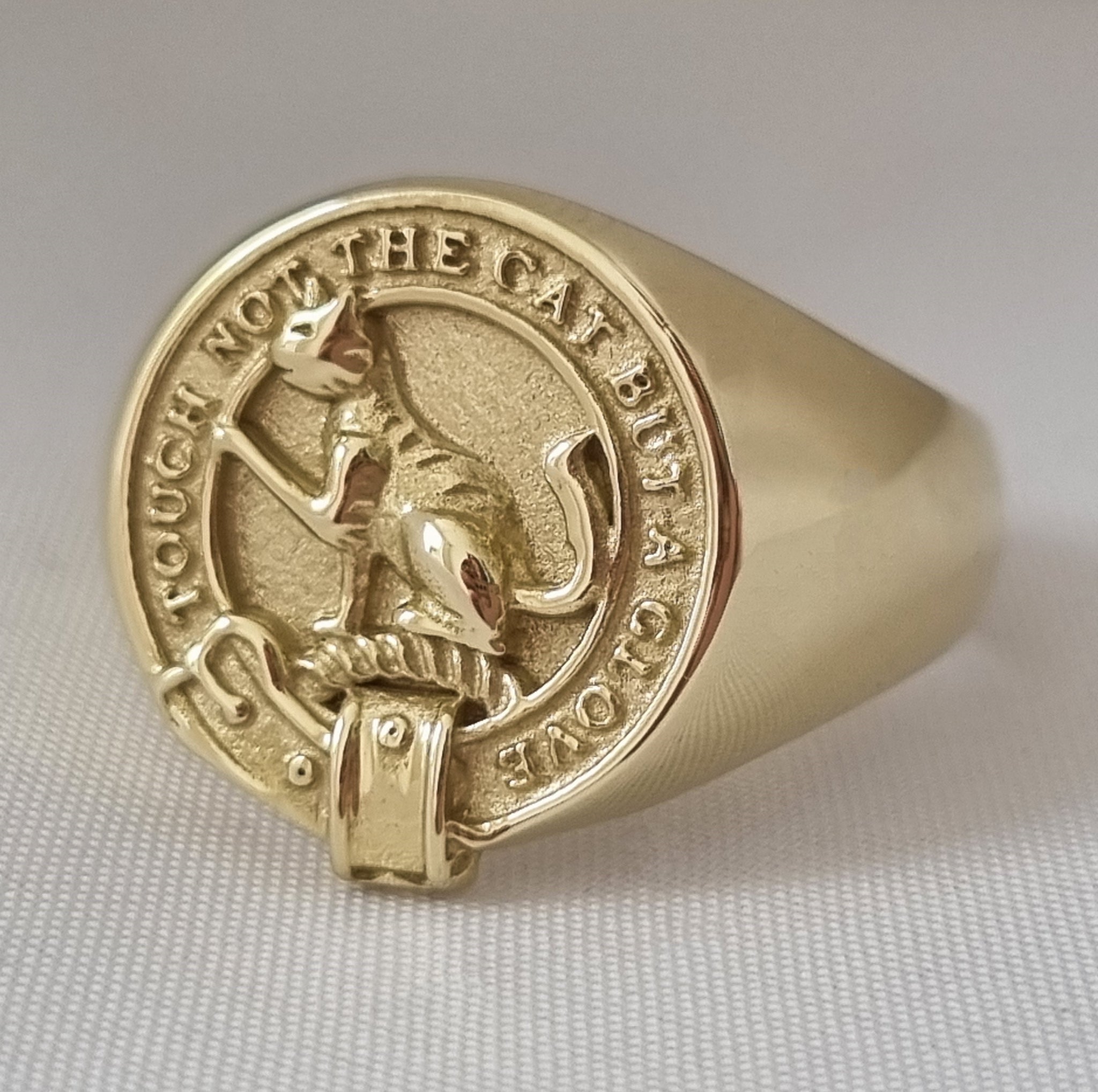 This magnificent MacPherson Clan Crest signet ring carries the crest of a seated wild cat and the proud MacPherson clan motto, 'TOUCH NOT THE CAT BUT A GLOVE'. The face measures about 17mm across and the band is polished and smooth, gently tapering from the face towards the back. This ring can be made to order in sterling silver. Gold available on request (POA).
